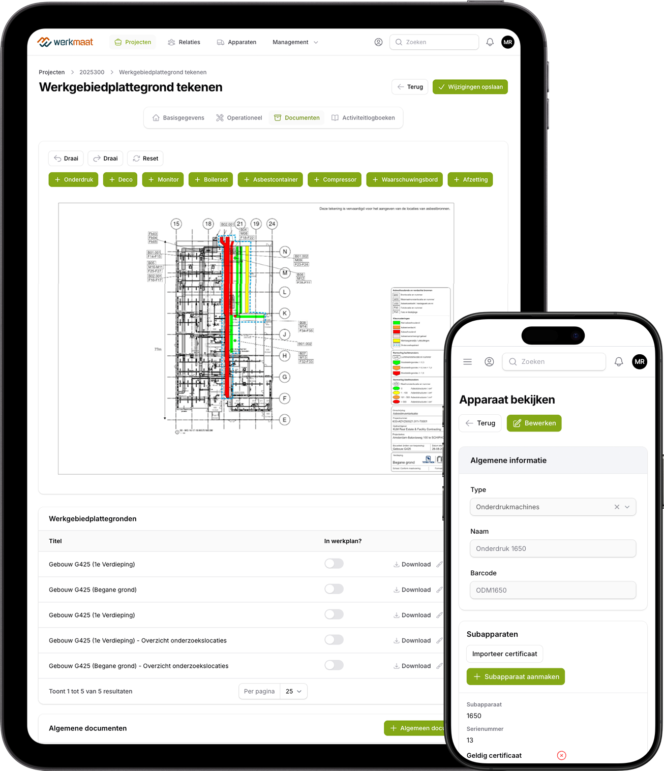 Volledige grip op alle projectfases Met Werkmaat beheert u het totale saneringsproces. Van het opstellen van het Dossier Asbestverwijdering (DAV) tot de eindvrijgave: alle data is realtime beschikbaar en gecontroleerd.